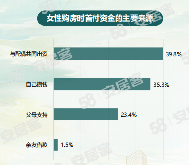 58同城、安居客《2024女性置業調查報告》調研數據顯示,參與調研的女性中,有35.3%的女性首付主要來源是靠自己攢錢。四成的女性選擇與另一半共同出資買房,也有23.4%的女性表示購房首付需要父母支持。未婚女性中,靠自己攢錢買房的佔比最高,為45.5%。與往年相比,自已攢錢出首付買房的女性佔比有所提高。
