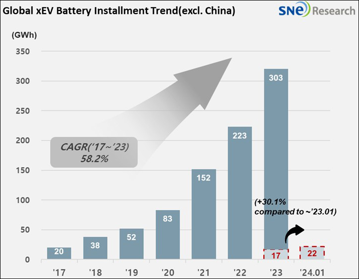 3月8日,韓國能源市場調研機構SNE Research發佈統計結果顯示,今年1月在除中國以外全球市場銷售的純電動汽車、插電式混合動力車、混合動力車搭載的電池總量較去年同期增加43.2%,達到319.4千兆瓦時(GWh)。