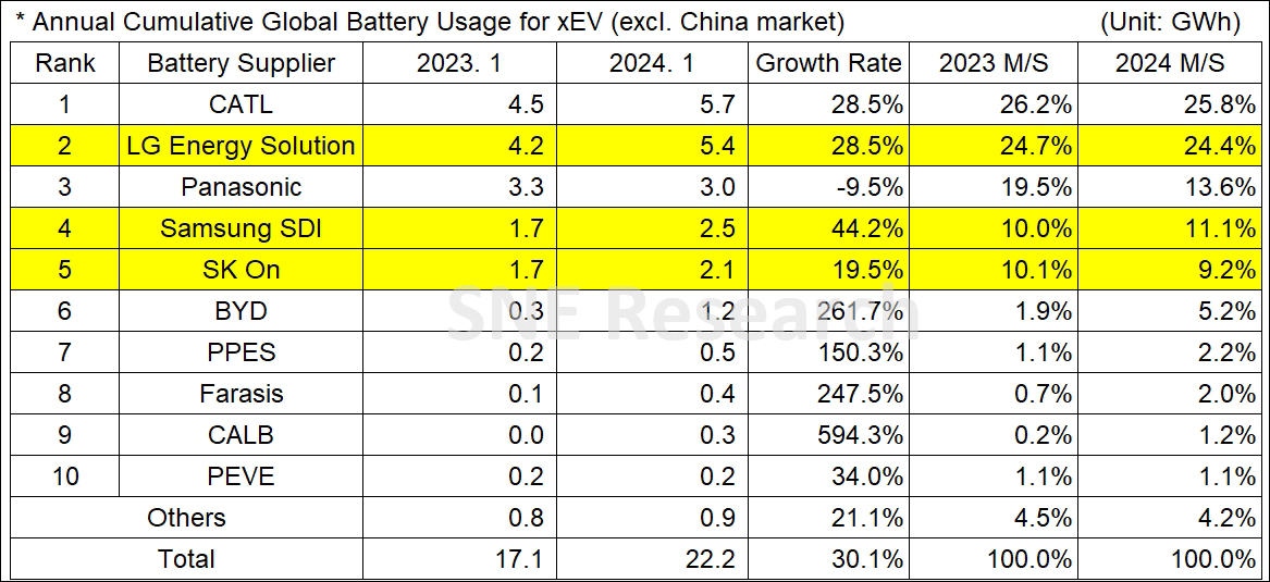 韓國三星SDI以同比增加44.2%的2.5GWh位居第四,佔有率達到11.1%;SK on以同比增長19.5%的2.1GWh佔據9.2%的市場,位居第五。韓聯社8日報道説,算上SK新能源,韓國三大動力電池製造商在中國以外市場的裝機量同比增長,但市佔率總和同比下降0.1%,為44.7%。