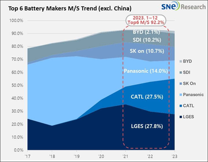除中國以外的全球電動汽車電池市場上,各大電池製造商市佔率變化 圖片來源:SNE Research