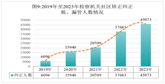 3.加強非監禁刑執行監督。強化社區矯正監督,發佈典型案例,出版《社區矯正檢察監督實務研究與案例指引》,對監外執行條件消失的,督促收監執行3652人。聯合最高法開展“雷霆2023”專項活動,經檢察監督推動執行案件3491件,涉及金額數億元。社區矯正對象王某某漏管法律監督一案,檢察機關強化對社區矯正交付接收環節檢察監督,深挖背後司法工作人員失職瀆職犯罪,王某某被撤銷緩刑,與所犯新罪數罪併罰,合併執行有期徒刑二十一年,對社區矯正漏管背後的相關司法工作人員職務犯罪立案偵查。