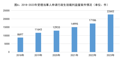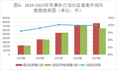3.行政審判活動監督更有實效。2018年以來受理行政審判活動監督案件分別是:2018年1215件、2019年3316件、2020年6872件、2021年10325件、2022年15693件,年均增加89.6%。經過連續五年監督,監督效果初步體現。2023年共受理14967件,同比下降4.6%。其中,依職權受理佔95.5%;依申請受理佔4.5%。針對超期立案、超期審理、違反規定送達法律文書等審判程序違法問題,向法院提出檢察建議13491件,同比下降6.8%。