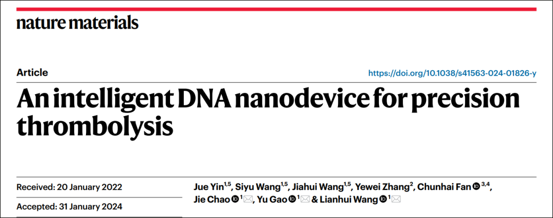 微信公眾號“南京郵電大學”3月9日消息,近日,有機電子與信息顯示國家重點實驗室和生物智能材料與診療技術國家級重點實驗室培育建設點汪聯輝教授、晁潔教授和高宇副教授帶領科研團隊開發了一種智能DNA溶栓納米機器,可在血管內複雜病生理環境下識別血栓的生物標誌物凝血酶,並通過針對凝血酶濃度的邏輯運算區分血栓和傷口凝塊,實現靶向血栓的精準給藥,相關工作以“An intelligent DNA nanodevice for precision thrombolysis”為題發表在Nature Materials期刊。汪聯輝教授、晁潔教授、高宇副教授為論文的共同通訊作者,博士生印珏、王思雨、王嘉輝為論文共同第一作者。