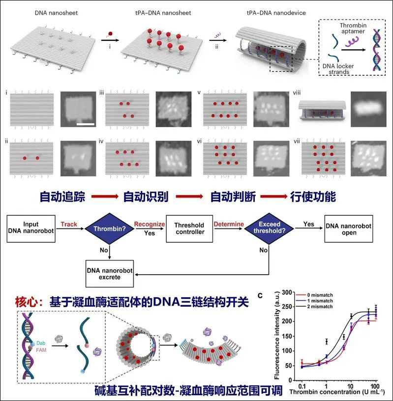 團隊研究人員首先基於DNA摺紙技術構建了90×60納米的矩形納米片,並在其表面實現溶栓藥物tPA分子空間和數量上的精準可控裝載。隨後利用DNA三鏈結構,設計了可邏輯運算的DNA納米鎖,將矩形納米片捲曲關閉形成納米管以保護藥物活性。含有凝血酶適配體的DNA納米鎖是溶栓納米機器的計算核心,按照設定順序自動執行針對凝血酶的追蹤識別、邏輯運算和響應打開的系列任務。針對血栓和傷口凝塊中凝血酶濃度的差異,裝備有特定凝血酶濃度閾值控制器的DNA納米溶栓機器首次在動物體內實現針對凝血酶濃度的邏輯運算,可準確區分正常纖維蛋白凝塊及血栓,顯著降低了溶栓藥物造成的凝血異常,實現智能化的精準給藥,並在腦中風、肺栓塞、頸動脈及腿靜脈血栓動物模型中得到驗證。