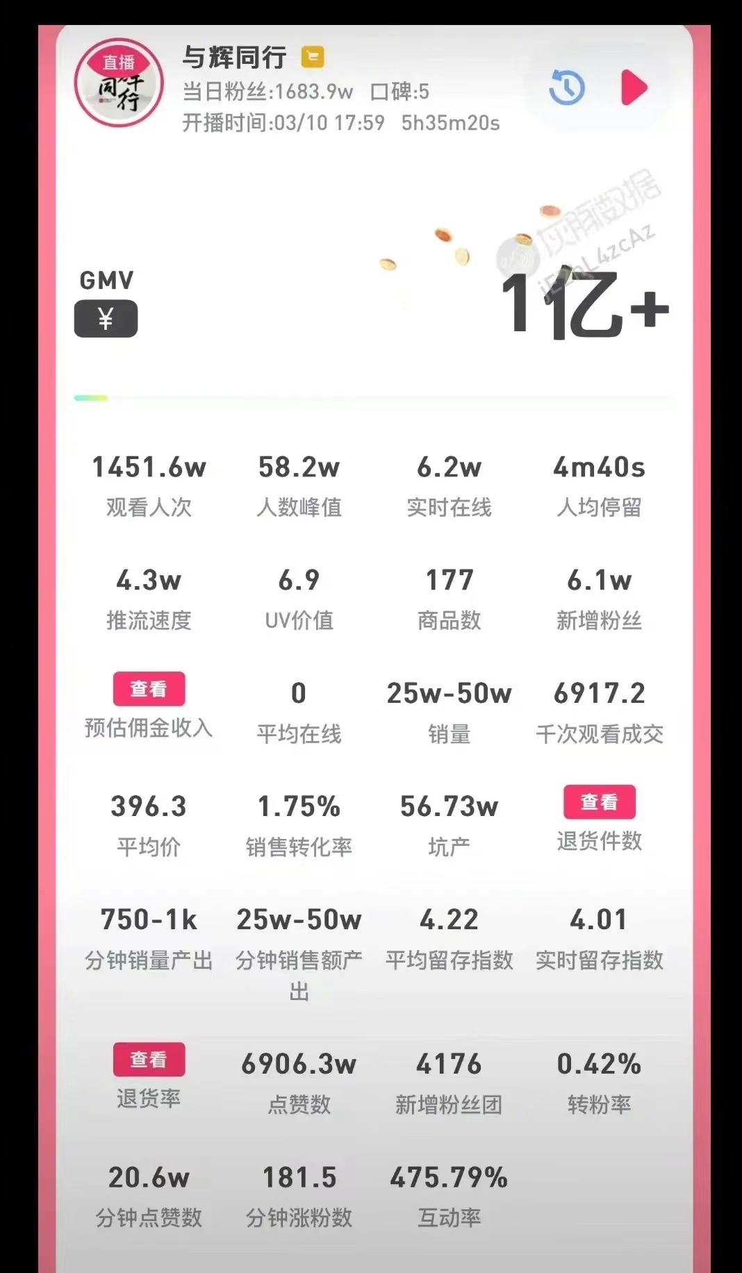 春節前,非凡大師品牌大使劉德華亦曾來到過“與輝同行”直播間宣傳新片,據三方平台的數據,當天包括劉德華新片門票的銷售在內,“與輝同行”直播間GMV為7153萬。