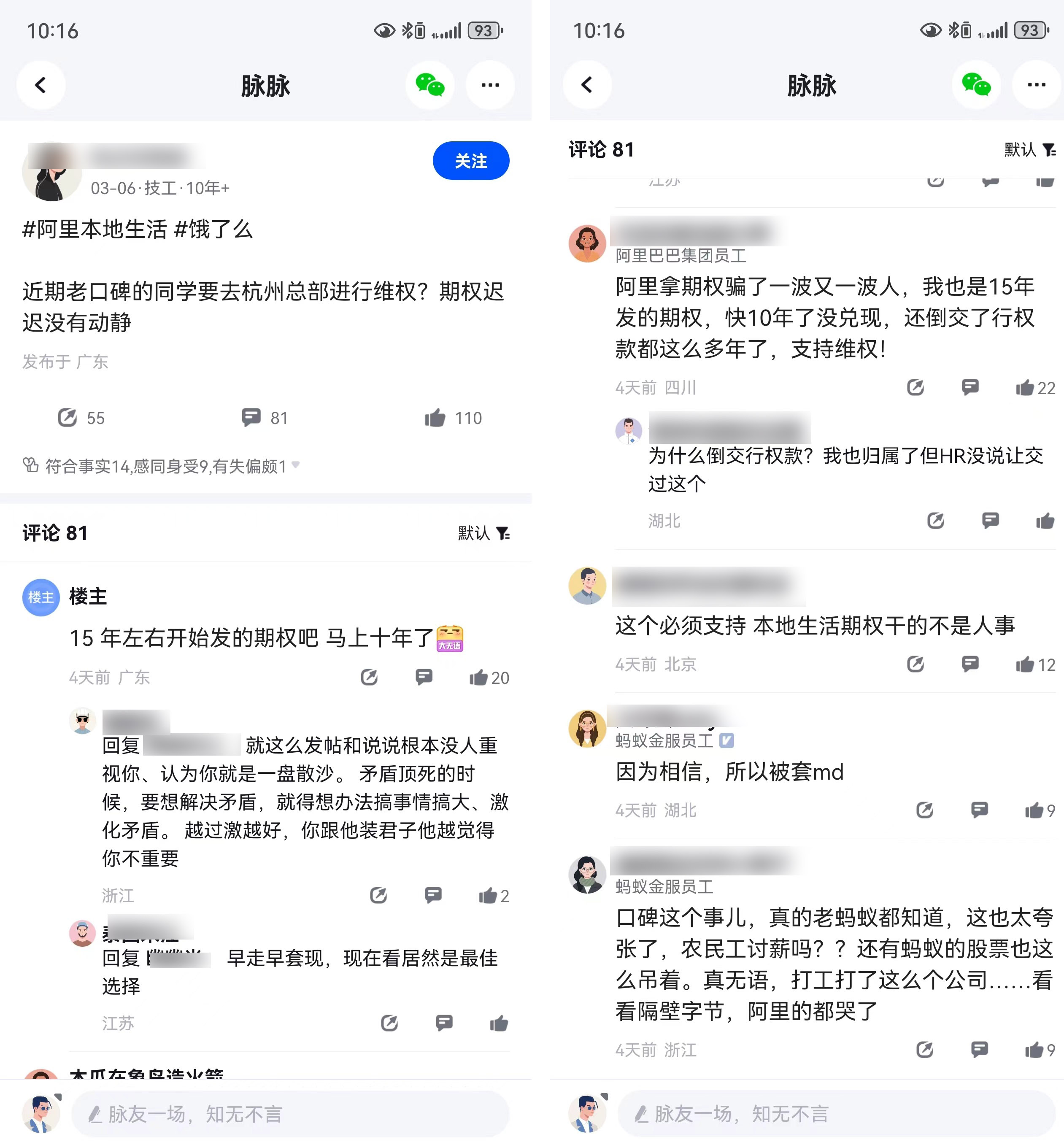 在社交媒體上,日前有人爆料稱,由於承諾的期權遲遲沒有動靜,阿里本地生活員工近期正在醖釀一場維權行動;在近日的一些媒體的報道中,也出現了“口碑312溝通羣(312)”,羣裏成員以接龍的方式,錄入花名和工號,訴求是“按口碑21年13.5同等價格美金回購”。