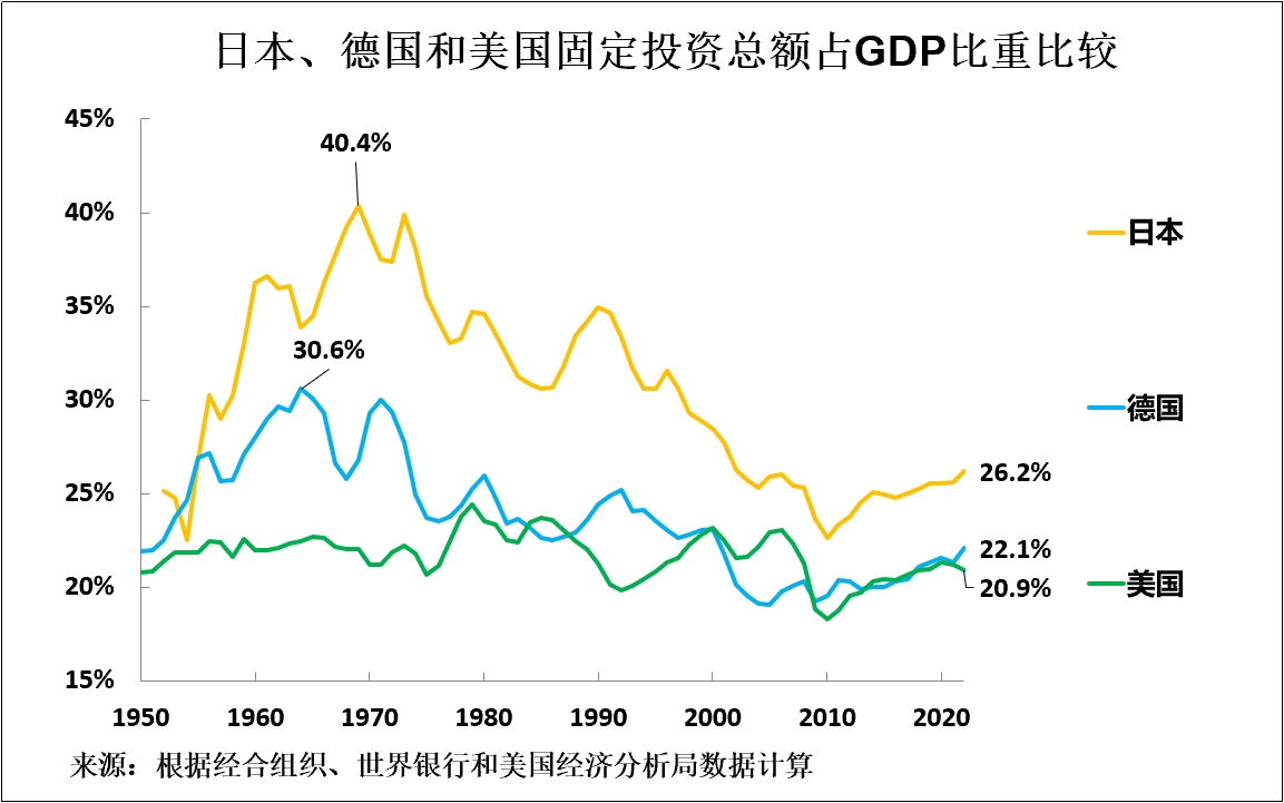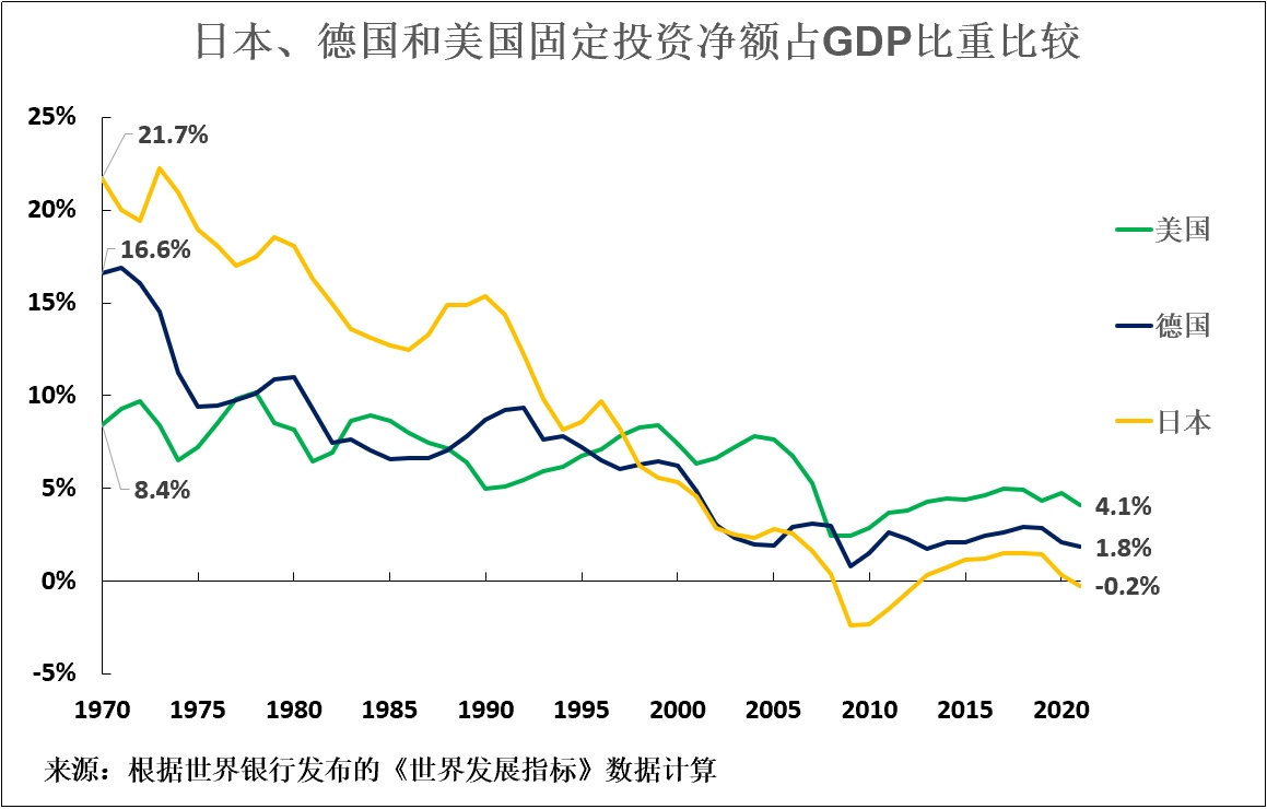 1970年,日本固定投資淨額佔GDP比重為21.7%,德國為16.6%,美國為8.4%。正如本文開頭所指出的,投資與經濟增長之間的關係反映為何德國和日本當時的GDP增速遠快於美國——得益於資本存量增加,德國的固定投資淨額佔GDP比重高出美國8.2%,日本的則高出美國13.3%。世界銀行發佈的最新國際可比數據顯示,截至2021年,美國固定投資淨額佔GDP比重實際上高於德國和日本,其GDP年增長率也是如此。1970年至2021年,美國的固定投資淨額佔GDP比重下降4.3%——從8.4%降至4.1%,德國的固定投資淨額佔GDP比重下降14.8%——從16.6%降至1.8%,日本的固定投資淨額佔GDP比重則降幅驚人——從21.7%降至-0.2%。到2021年,日本固定資本形成淨額為負。也即是説,日本資本存量實際上正在下降。