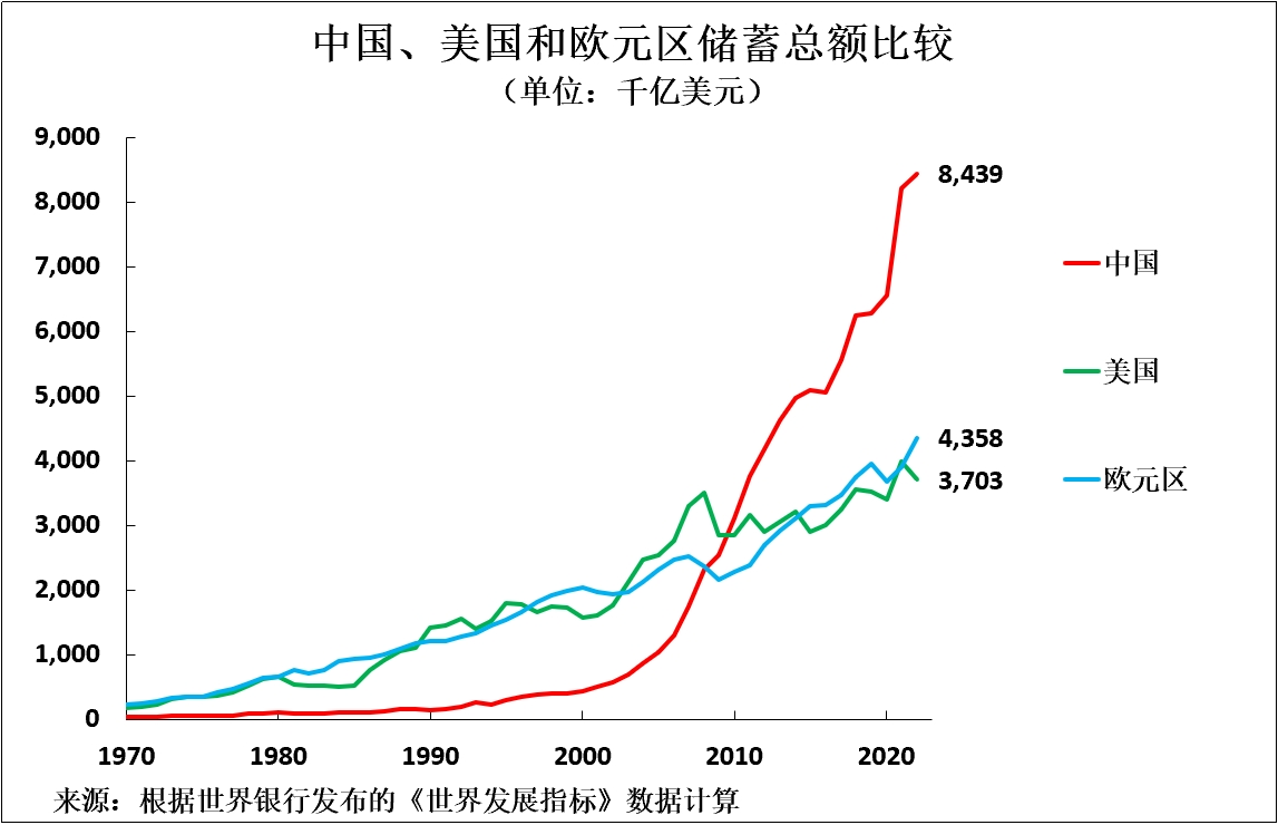 從國內來看,除了這些外匯儲備之外,中國的國內儲蓄總額(資本形成總額)遠遠超過任何其他國家。如圖4所示,中國曆年資本形成總額甚至遠遠超過其他任何國家。根據世界銀行最新數據,2022年中國儲蓄總額為8.4萬億美元,是美國(3.7萬億美元)的兩倍多。中國的資本形成總額超過美國加上歐元區(4.4萬億美元)的總和。