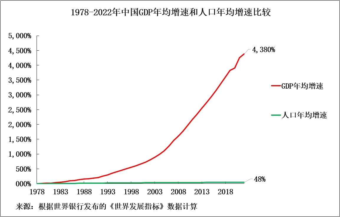 要想清楚地瞭解量化的實際情況,首先要進行一個基本的粗略計算。如圖5所示,從1978年到2022年,中國GDP增長4380%,而人口增長48%。1978年至2022年,中國GDP年均增速為9.0%,而中國人口年均增速為0.9%。總之,8.1%的GDP年均增長,即90%的GDP總增長,不是人口增長的結果。