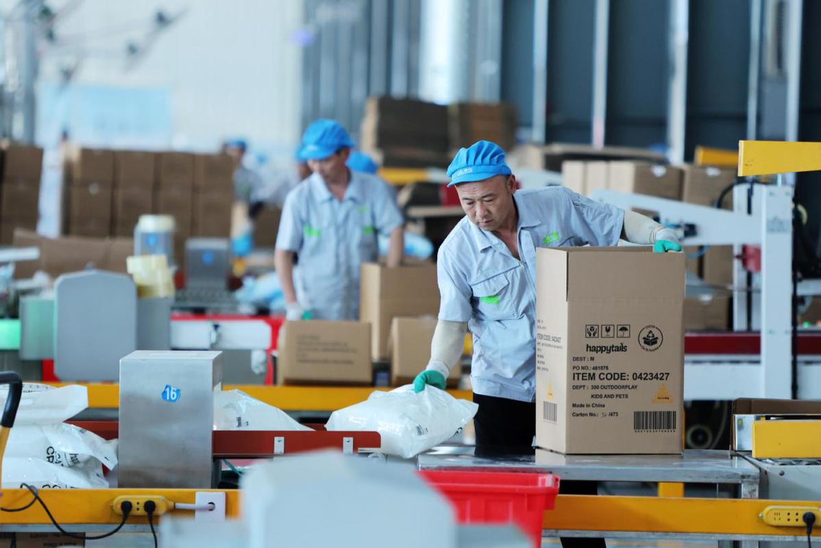 山東辛化硅膠有限公司,工人在包裝出口的貓砂產品。圖自新華社