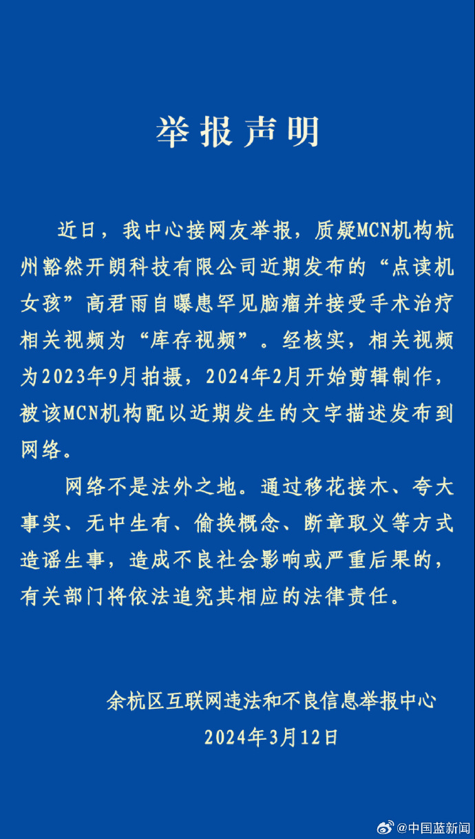 近日,杭州市餘杭區互聯網違法和不良信息舉報中心接網友舉報,質疑MCN機構杭州豁然開朗科技有限公司近期發佈的“點讀機女孩”高君雨自曝患罕見腦瘤並接受手術治療相關視頻為“庫存視頻”。經核實,相關視頻為2023年9月拍攝,2024年2月開始剪輯製作,被該MCN機構配以近期發生的文字描述發佈到網絡。