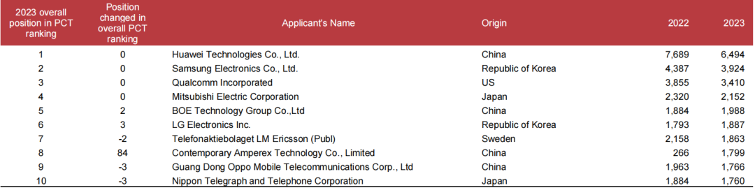 中國電信巨頭華為技術有限公司的PCT申請量仍位居榜首,在2023年公佈了6,494件PCT申請。大韓民國的三星電子位居第二(3,924件申請),緊隨其後的是美國的高通公司(3,410件)、日本的三菱電機(2,152件)和中國的京東方科技(1,988件)。在前十位申請人中,中國的寧德時代增長最快,2023年公佈的申請量增加了1,533件,排名上升了84位至第八位。相比之下,排名第一的華為技術有限公司在2023年公佈的申請量同前一年相比減少了1,195件。