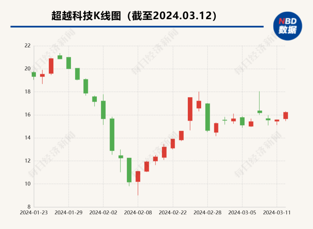股價方面,2月8日以來,超越科技股價開啓反彈,截至3月12日收盤,該股股價報16.22元。按此價格計算,高志江持有的2742.77萬股價值已經達到近4.45億元。