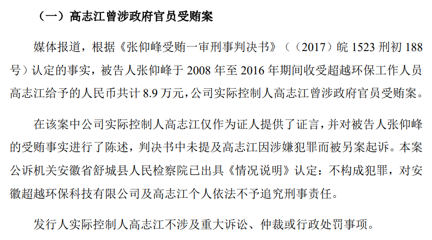 2021年時,超越科技曾在其招股説明書中指出,在該案中公司實際控制人高志江僅作為證人提供了證言,並對被告人張仰峯的受賄事實進行了陳述,判決書中未提及高志江因涉嫌犯罪而被另案起訴。本案公訴機關安徽省舒城縣人民檢察院已出具《情況説明》認定:不構成犯罪,對安徽超越環保科技有限公司及高志江個人依法不予追究刑事責任。公司實際控制人高志江不涉及重大訴訟、仲裁或行政處罰事項。