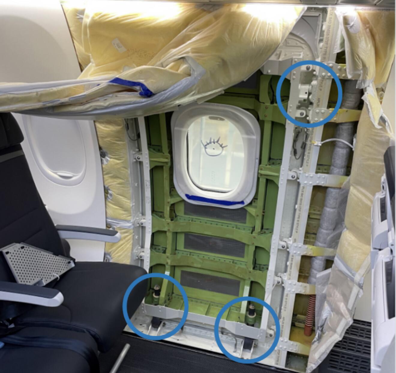 NTSB調查中獲得的門塞維修後安裝時的照片,四個關鍵緊固件安裝位置能看到的三個沒有擰上螺絲
