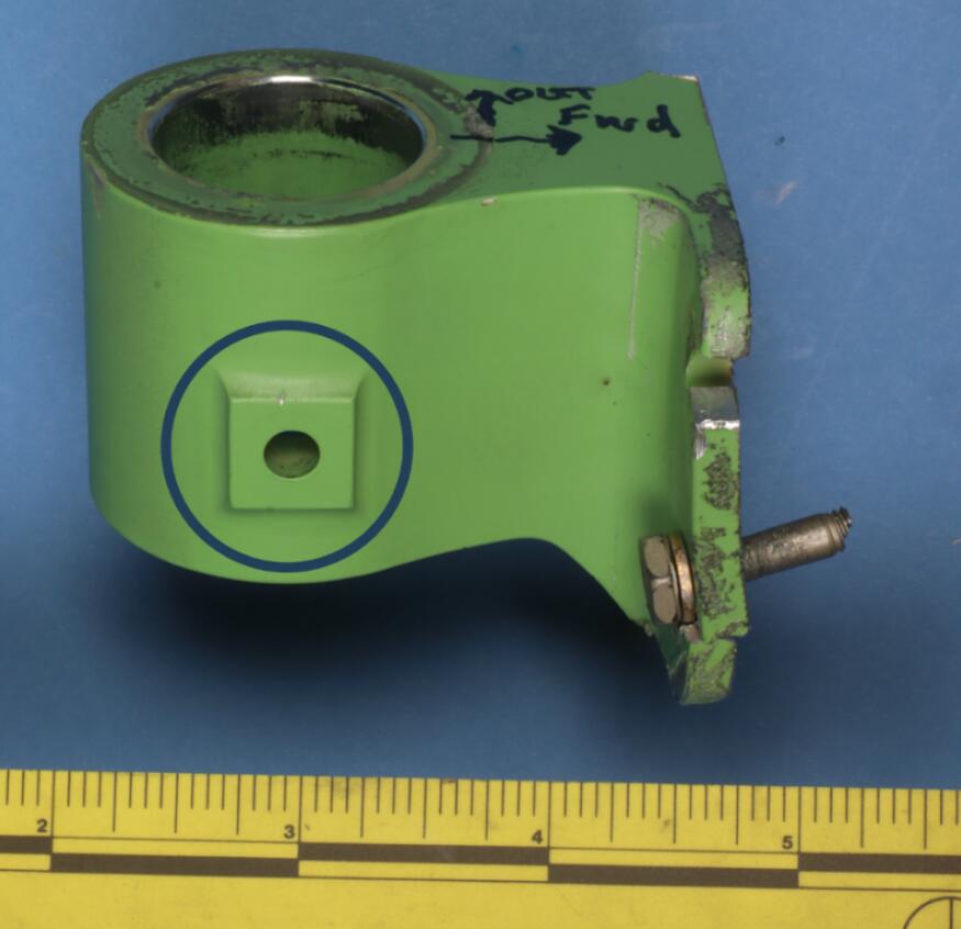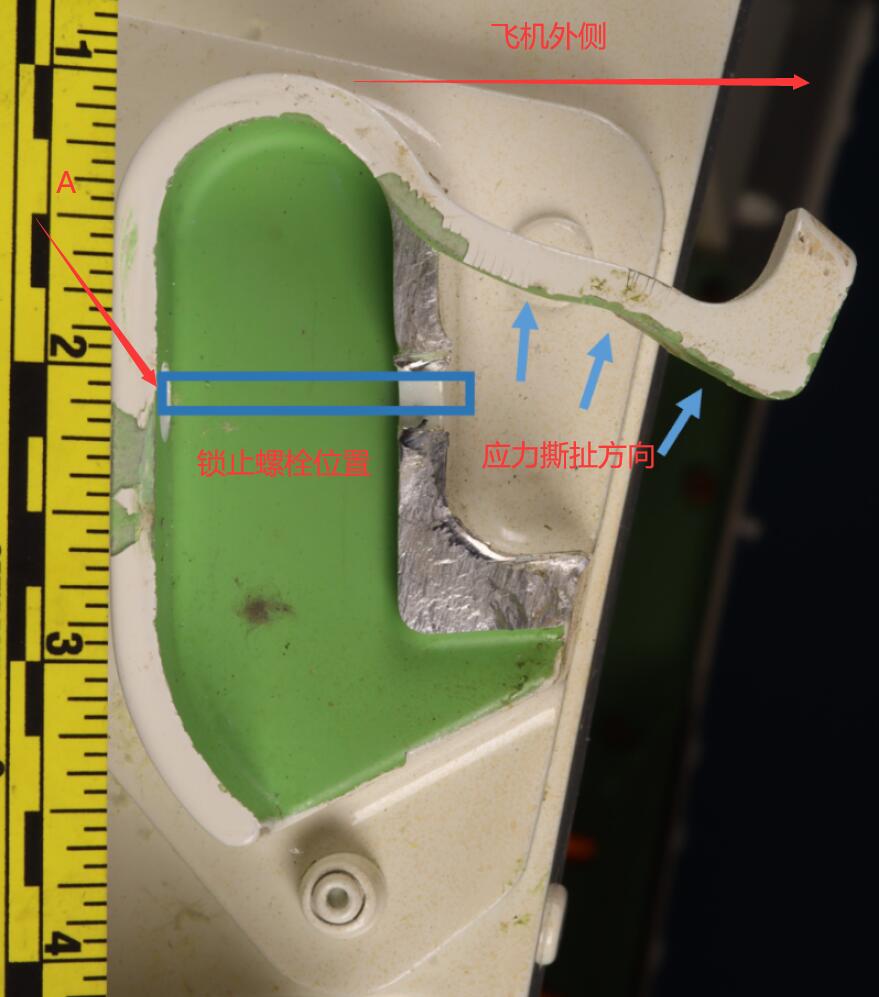 “飛門事件”中事故飛機門塞緊固件的情況,可以清楚地看到該擰鎖止螺栓的位置完好無損,沒有任何螺栓被撕扯留下的破壞痕跡