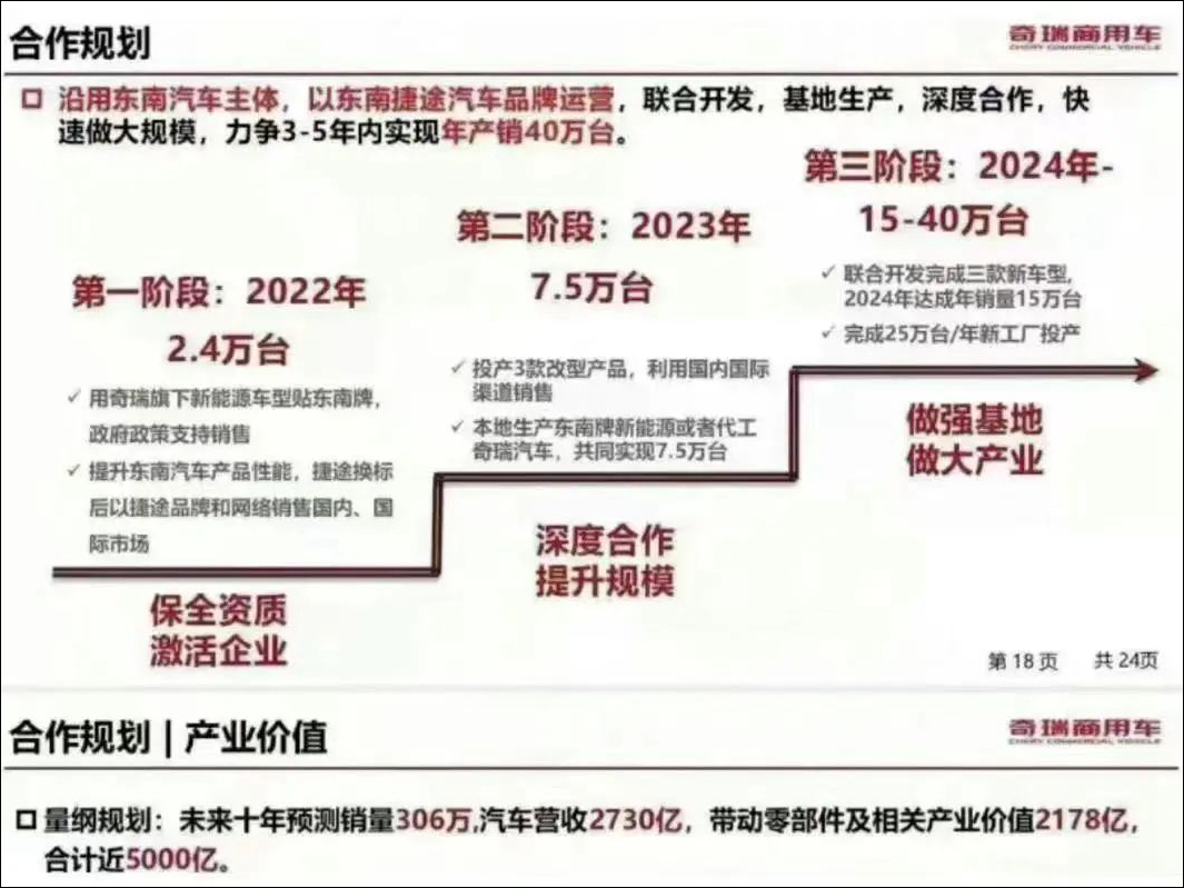 根據協議,2022年為雙方合作的第一階段,以換標奇瑞、捷途車型提升東南汽車產品力來保全生產資質,年銷目標為2.4萬輛;2023年為第二階段,通過代工投產3款改型產品,年銷目標為7.5萬輛;2024年及以後為第三階段,雙方聯合開發3款新車型,2024年年銷目標為15萬輛,其後完成年產25萬輛新工廠投產,最終在3-5年內達到年銷40萬輛的目標。