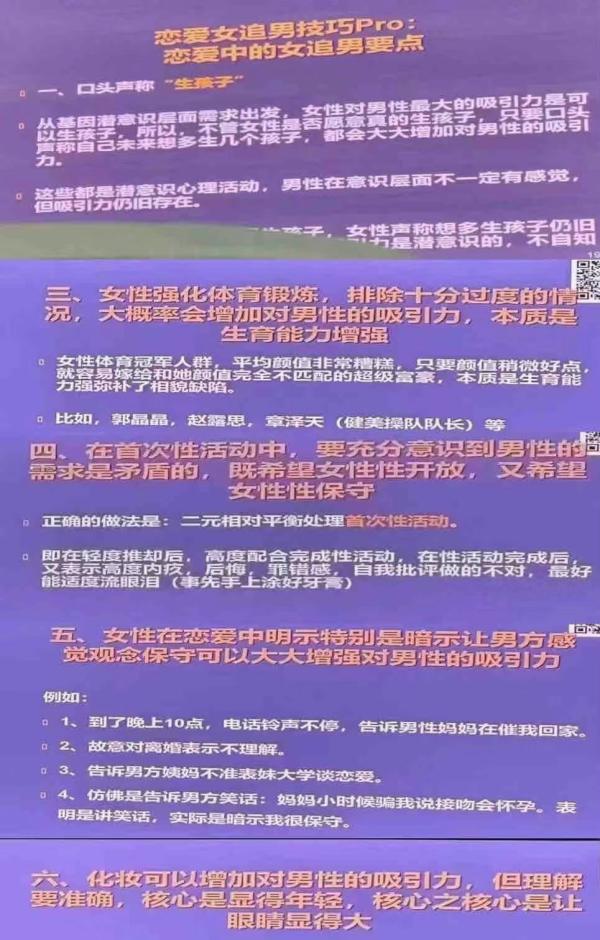 網傳課件的標題顯示為“戀愛女追男技巧Pro:戀愛中的女追男要點“,其中進行了幾個“要點”的羅列,如“口頭聲稱‘生孩子’”、”女性強化體育鍛煉,排除十分過度的情況,大概率會增加對男性的吸引力,本質是生育能力增強”、“在首次性活動中,要充分意識到男性的需求是矛盾的,既希望女性性開放,又希望女性性保守”、“化妝可以增加對男性的吸引力,但理解要準確,核心是顯得年輕,核心之核心是讓眼睛顯得大”、“把自己的知識水平、心理水平、人品水平提升到你所希望的優質男性水準是很重要的必要而非充分條件”。