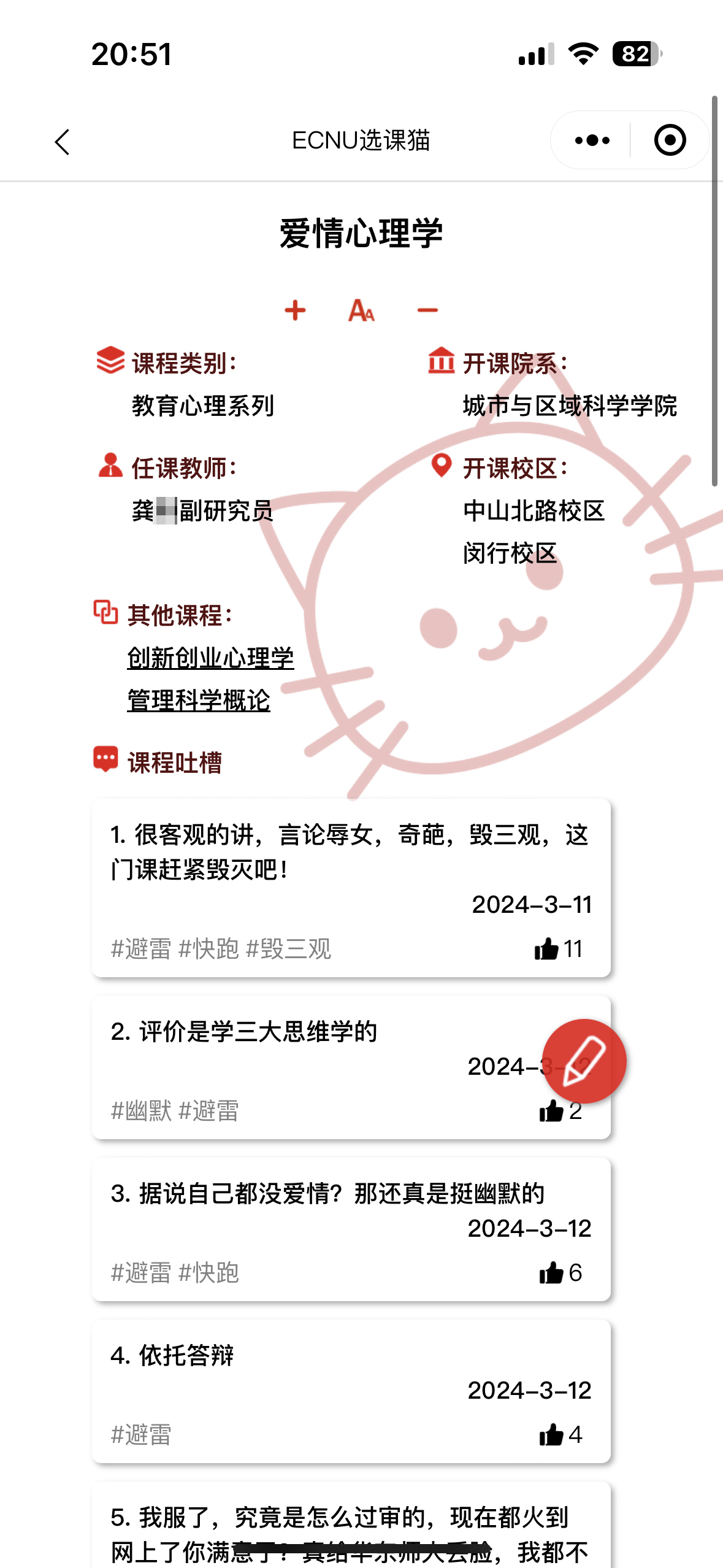 華東師大的“花獅選課貓”小程序顯示,《愛情心理學》課程類別為教育心理系列,任課教師為副研究員龔某。華東師大學生介紹,龔某的其他課程還包括《管理心理學》等。