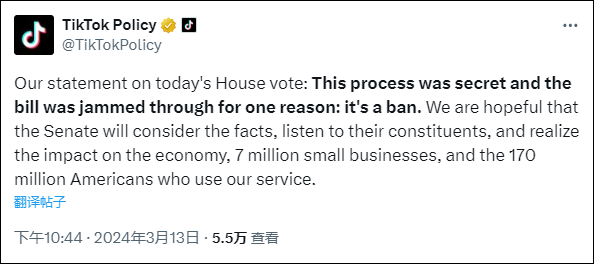 法案通過後,TikTok通過其X平台賬號發佈聲明作出回應。聲明稱:“這個(投票)過程是秘密的,法案被強行通過的原因只有一個:這是一項禁令。我們希望參議院能夠考慮事實,聽取選民的意見,並意識到這對於經濟、700萬小企業和1.7億使用我們服務的美國人的影響。”