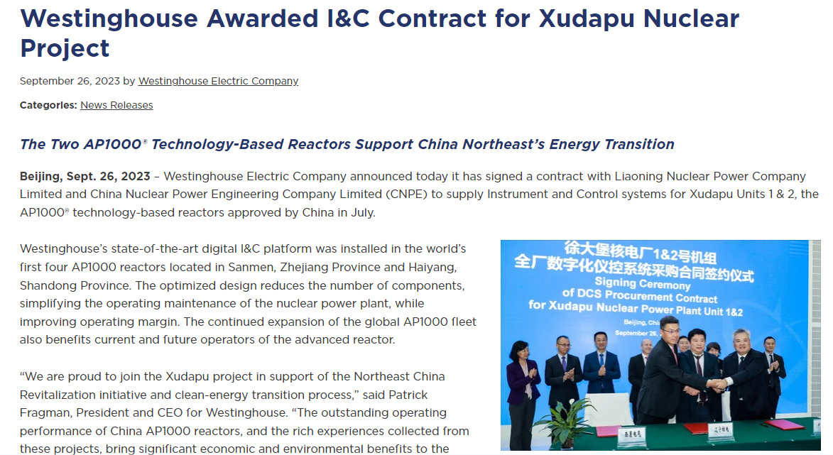 兩座 AP1000反應堆為中國東北能源轉型提供支持 圖源:西屋電氣官網