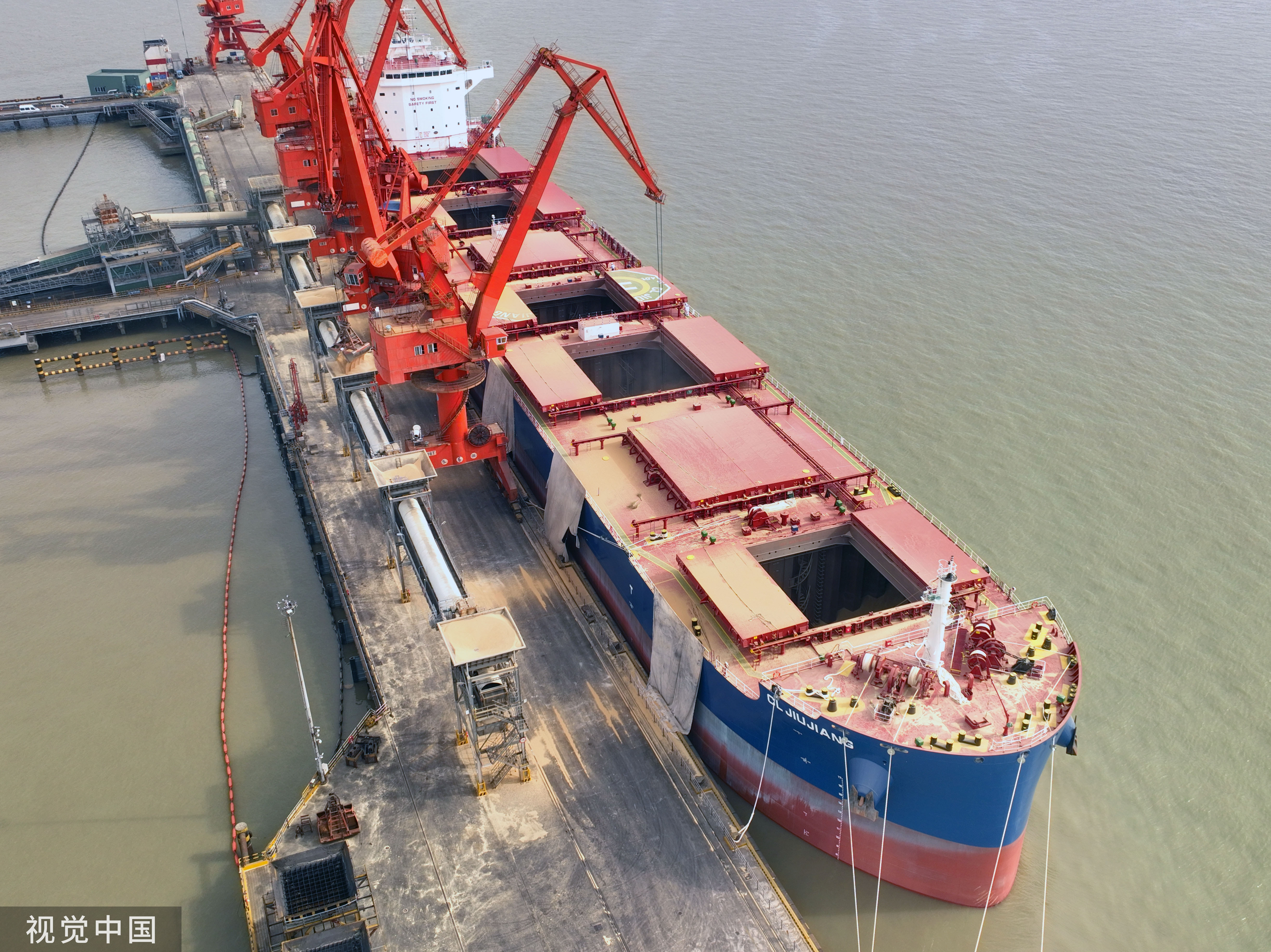 2023年4月10日,江蘇南通,嘉達碼頭正在卸運55000噸澳大利亞小麥。