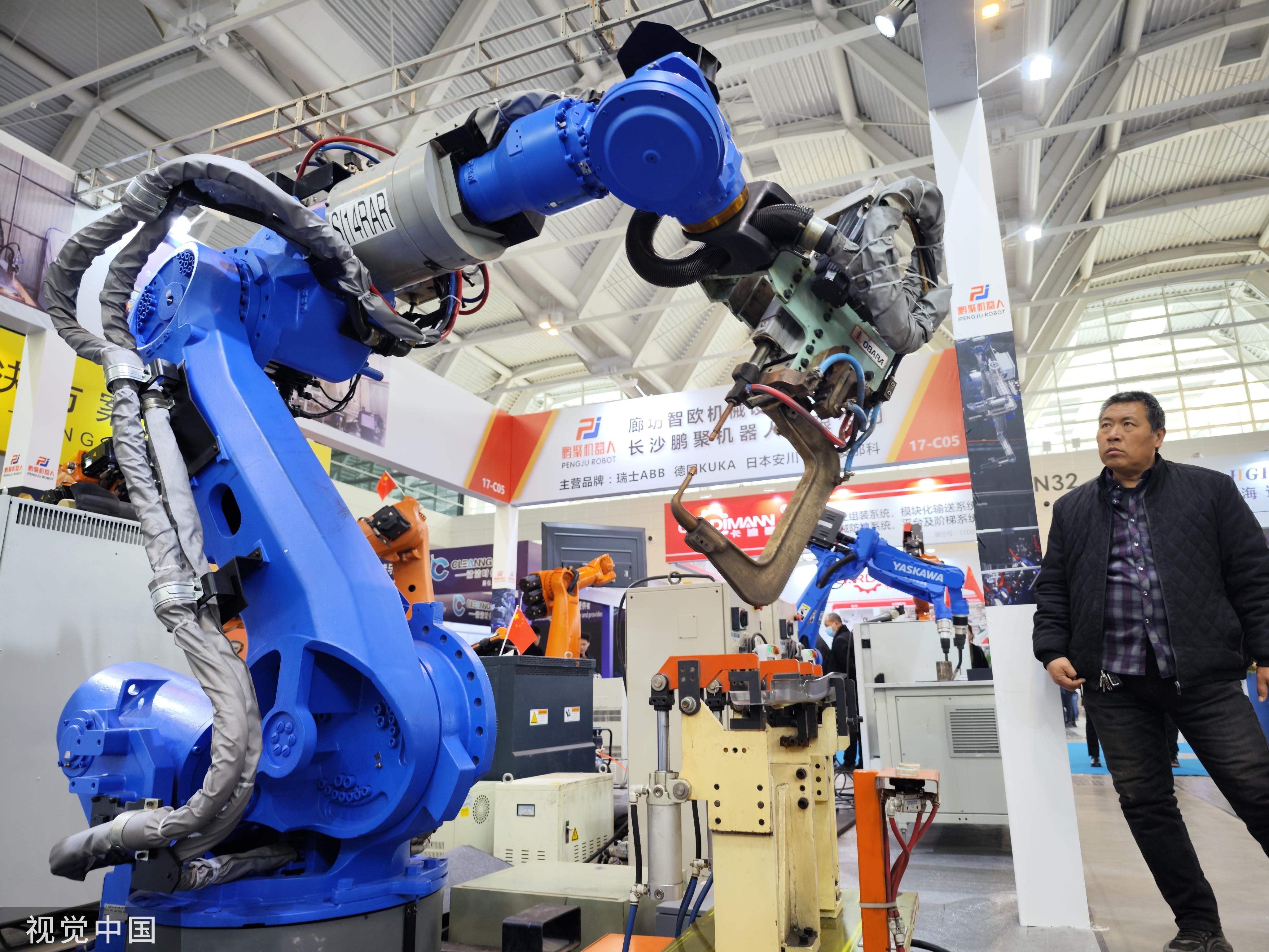 2024年3月6日,天津,第二十屆天津工博會現場,觀眾在機器人及自動化展區參觀工業機器人。