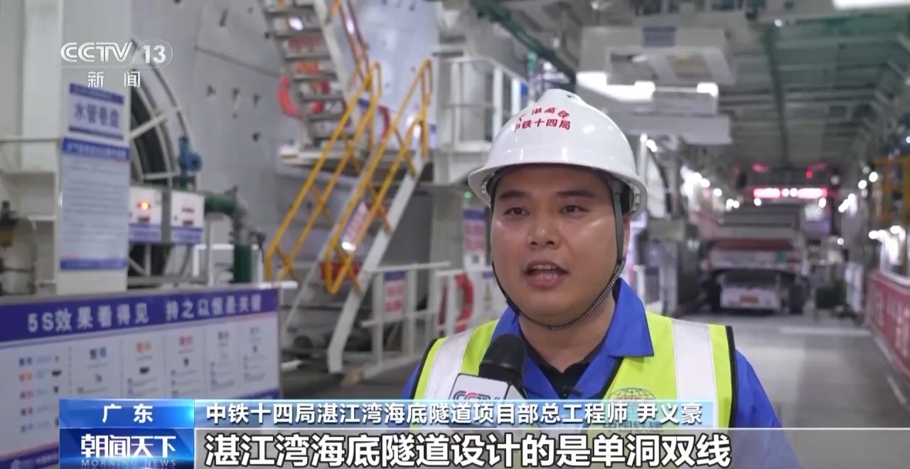 **中鐵十四局湛江灣海底隧道項目部總工程師 尹義豪:**湛江灣海底隧道設計的是單洞雙線,在未來上下行的兩條高速列車在隧道里面行駛,所以它的開挖斷面比較大,採用瞭如此大直徑的盾構機。