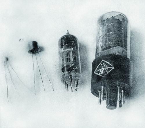 半導體研究室早期研製的硅平面晶體管(芝麻管,左一),右一為普通電子管。