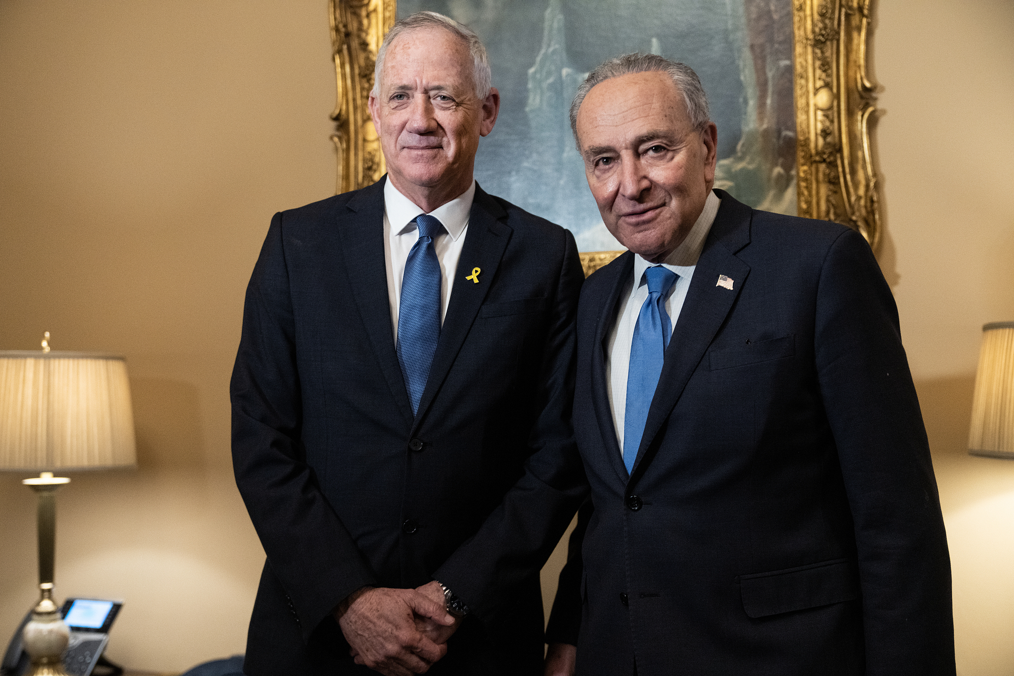 當地時間3月5日,美國華盛頓,參議院多數派領袖舒默(右)與本尼·甘茨進行私人會晤 圖自視覺中國
