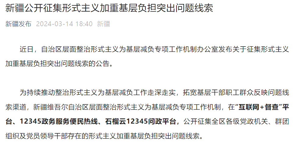 為持續推動整治形式主義為基層減負工作走深走實,拓寬基層幹部職工羣眾反映問題線索渠道,新疆維吾爾自治區層面整治形式主義為基層減負專項工作機制,在“互聯網+督查”平台、12345政務服務便民熱線、石榴雲12345問政平台,公開徵集全區各級黨政機關、羣團組織及黨員領導幹部存在的形式主義加重基層負擔突出問題線索。
