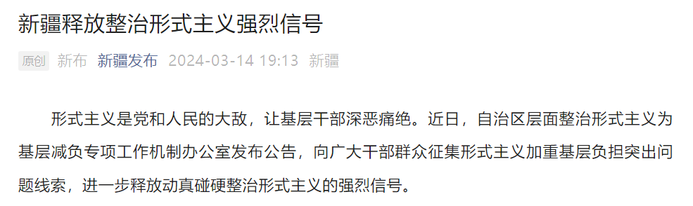 同日,新疆維吾爾自治區新聞辦還發布評論文章《新疆釋放整治形式主義強烈信號》。文章指出,形式主義是黨和人民的大敵,讓基層幹部深惡痛絕。近日,自治區層面整治形式主義為基層減負專項工作機制辦公室發佈公告,向廣大幹部羣眾徵集形式主義加重基層負擔突出問題線索,進一步釋放動真碰硬整治形式主義的強烈信號。