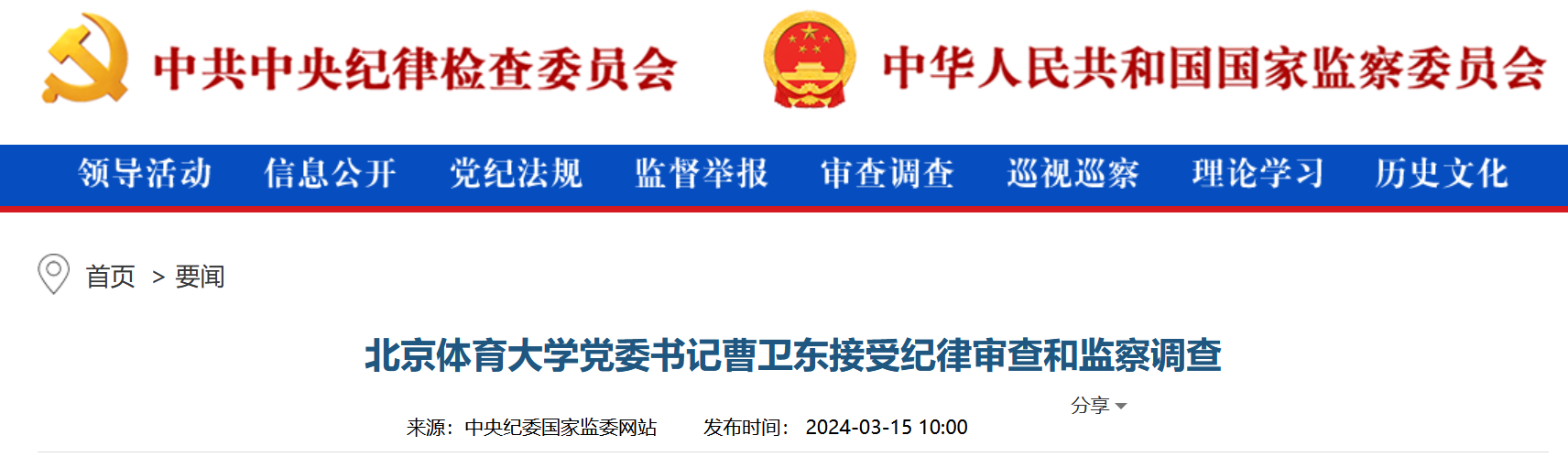 中央紀委國家監委網站3月15日通報,北京體育大學黨委書記曹衞東涉嫌嚴重違紀違法,目前正接受中央紀委國家監委駐國家體育總局紀檢監察組和吉林省長春市監察委員會審查調查。