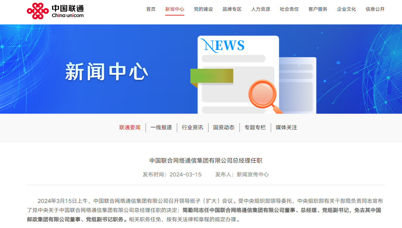 中國聯通網站消息,2024年3月15日上午,中國聯合網絡通信集團有限公司召開領導班子(擴大)會議。受中央組織部領導委託,中央組織部有關幹部局負責同志宣佈了黨中央關於中國聯合網絡通信集團有限公司總經理任職的決定:簡勤同志任中國聯合網絡通信集團有限公司董事、總經理、黨組副書記,免去其中國郵政集團有限公司董事、黨組副書記職務。相關職務任免,按有關法律和章程的規定辦理。