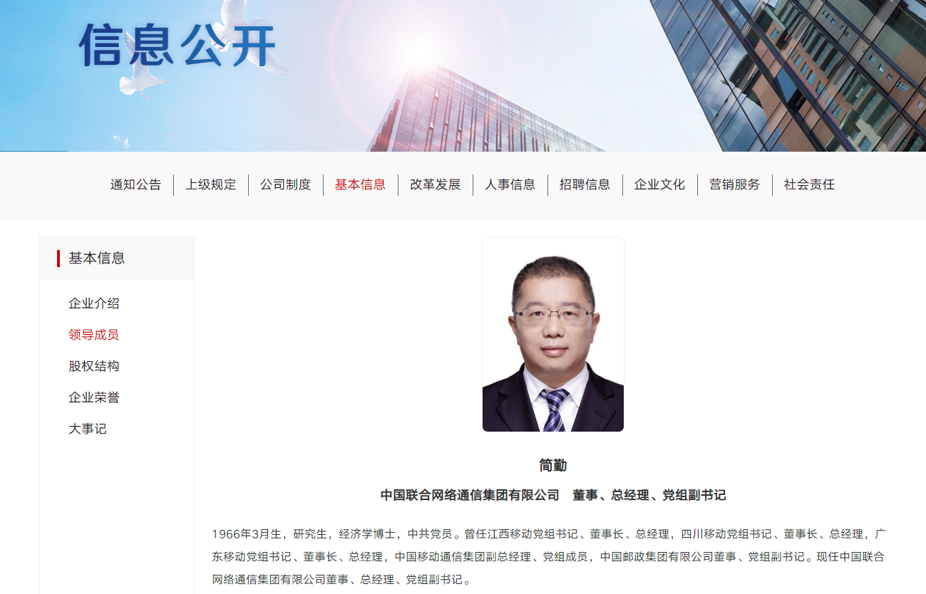 中國聯通網站簡歷顯示,簡勤中國聯合網絡通信集團有限公司董事、總經理、黨組副書記,1966年3月生,研究生,經濟學博士,中共黨員。曾任江西移動黨組書記、董事長、總經理,四川移動黨組書記、董事長、總經理,廣東移動黨組書記、董事長、總經理,中國移動通信集團副總經理、黨組成員,中國郵政集團有限公司董事、黨組副書記。現任中國聯合網絡通信集團有限公司董事、總經理、黨組副書記。