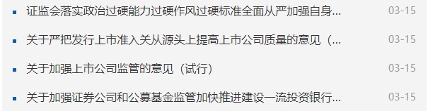 證監會網站15日消息,證監會會同有關方面制定出台了《關於嚴把發行上市准入關從源頭上提高上市公司質量的意見(試行)》、《關於加強上市公司監管的意見(試行)》、《關於加強證券公司和公募基金監管加快推進建設一流投資銀行和投資機構的意見(試行)》以及《關於落實政治過硬能力過硬作風過硬標準全面加強證監會系統自身建設的意見》等4項政策文件。