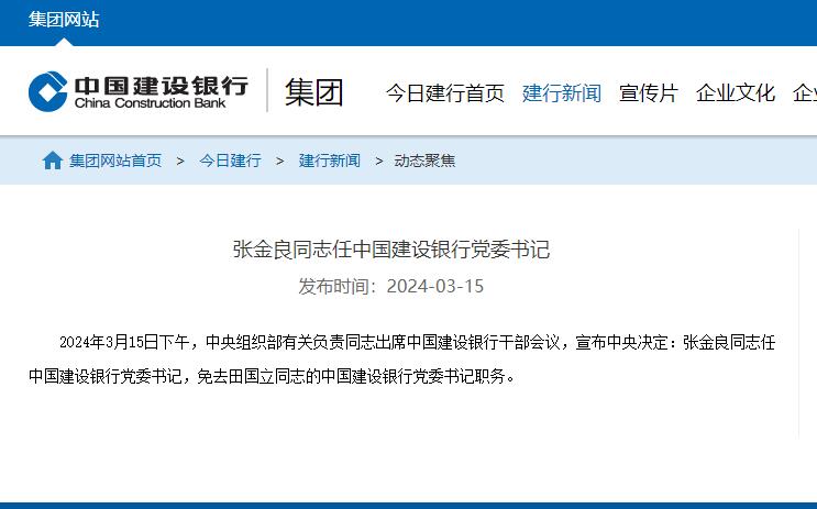 建行官網消息稱,2024年3月15日下午,中央組織部有關負責同志出席中國建設銀行幹部會議,宣佈中央決定:張金良同志任中國建設銀行黨委書記,免去田國立同志的中國建設銀行黨委書記職務。
