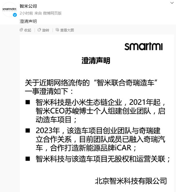智米科技表示,智米科技是小米生態鏈企業,2021年起由智米CEO蘇峻博士個人組建創業團隊,啓動造車項目;2023年,該造車項目創業團隊與奇瑞建立合作關係,目前團隊成員已融入奇瑞汽車,合作打造新能源品牌iCAR;智米科技與該造車項目無股權和運營關聯。