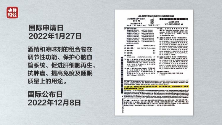 聽花酒申請的專利到底是什麼?根據聽花酒公開資料顯示,2022年1月27日,聽花酒申請的國際專利,名稱為《酒精和涼味劑的組合物在調節性功能、保護心腦血管系統、促進肝細胞再生、抗腫瘤、提高免疫及睡眠質量上的用途》,公佈日為2022年12月8日。