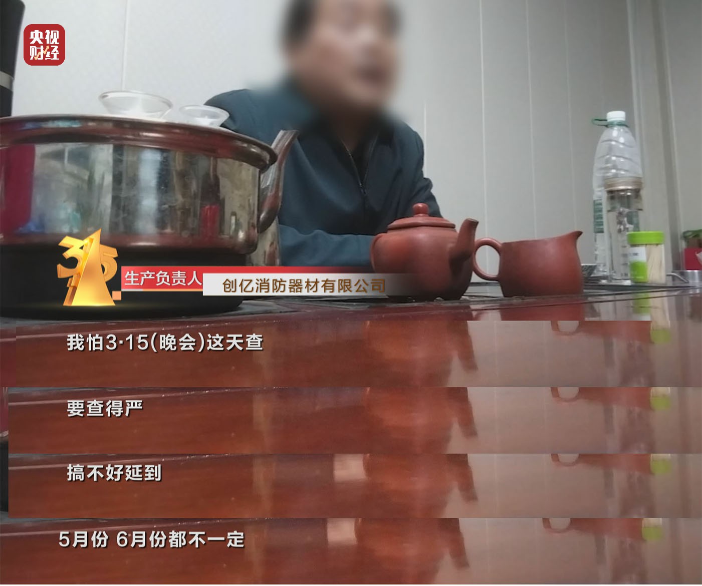 創億消防器材有限公司 生產負責人:我怕3·15晚會這天查,要查得嚴。搞不好延到五月份、六月份都不一定。