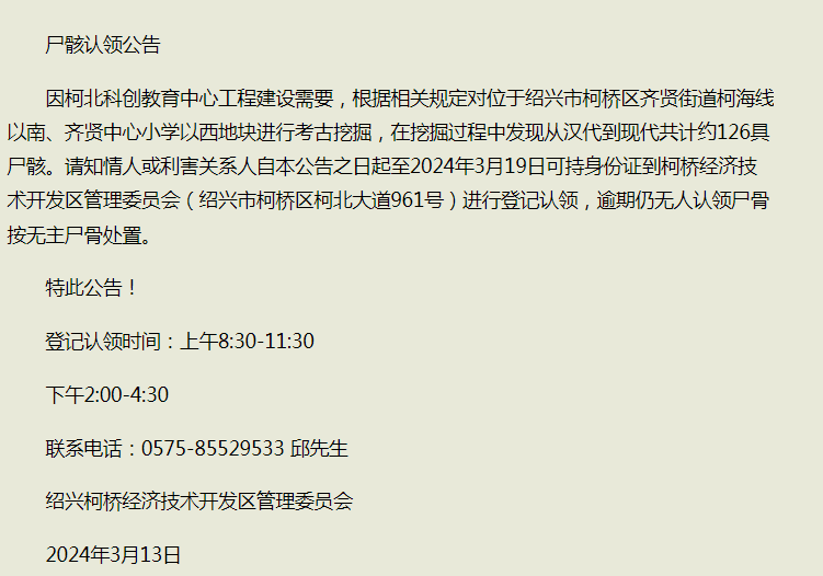 紹興柯橋經濟技術開發區管委會3月13日發佈兩則屍骸認領公告,稱當地兩個工程項目在進行考古挖掘時分別發現126具、74具屍骸,知情人或利害關係人可在19日前持身份證到管委會登記認領,逾期無人認領將按無主屍骨處置。
