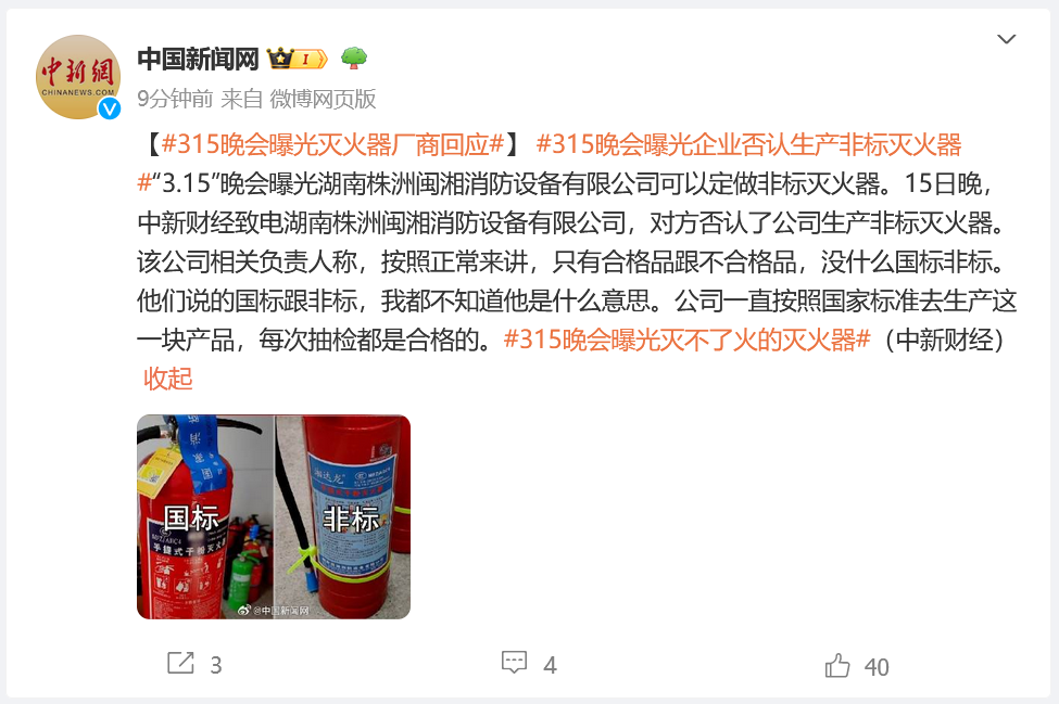 315晚會曝光企業否認生產非標滅火器:公司每次抽檢都合格