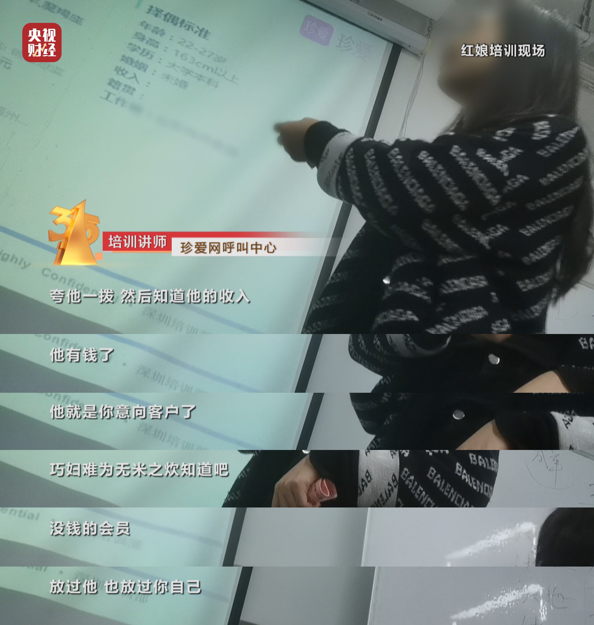 上崗前的培訓,婚戀平台從經理到培訓老師,再到培訓好的銷售紅娘,職業的重點不是促成一對對的千里姻緣,而是如何用欺騙性的“話術”引誘消費者,目的就是為了業績提成。
