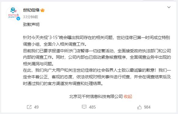 3月15日晚間,@世紀佳緣 發佈致歉聲明:針對今天央視“3·15”晚會曝出我司存在的相關問題,世紀佳緣已第一時間成立特別調查小組,全面介入相關調查工作。目前我們已要求報道中所涉門店暫停一切經營活動,全面接受政府執法部門和公司內部的調查工作。同時,公司內部也已啓動緊急核查程序,全面調查業務中出現的相關漏洞與問題。