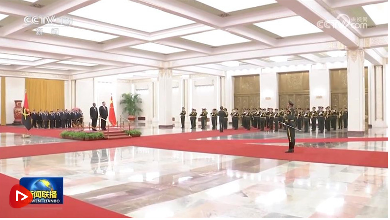 天安門廣場鳴放21響禮炮,禮兵列隊致敬。兩國元首登上檢閲台,軍樂團奏中安兩國國歌。洛倫索在習近平陪同下檢閲中國人民解放軍儀仗隊,並觀看分列式。