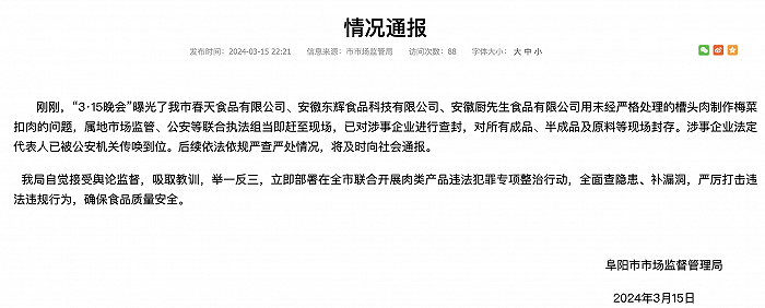 3月15日晚, 阜陽市市場監督管理局發佈情況通報:剛剛,“3·15晚會”曝光了我市春天食品有限公司、安徽東輝食品科技有限公司、安徽廚先生食品有限公司用未經嚴格處理的槽頭肉製作梅菜扣肉的問題,屬地市場監管、公安等聯合執法組當即趕至現場,已對涉事企業進行查封,對所有成品、半成品及原料等現場封存。涉事企業法定代表人已被公安機關傳喚到位。後續依法依規嚴查嚴處情況,將及時向社會通報。