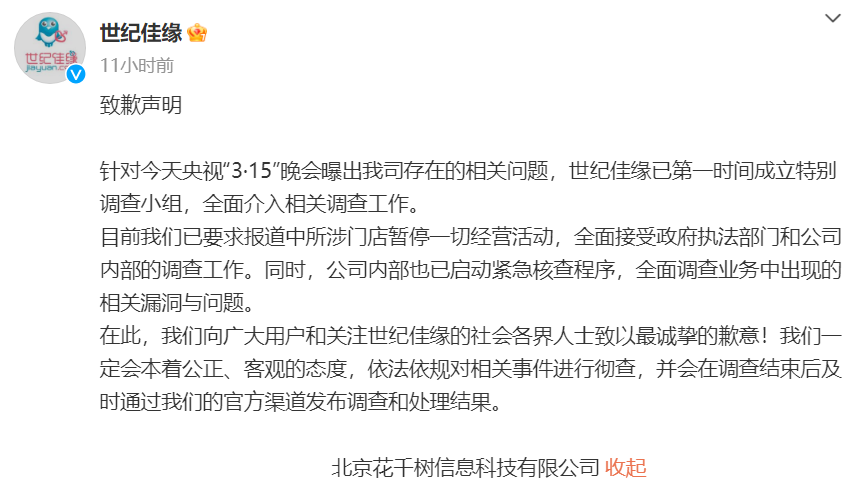 3月15日晚,@世紀佳緣 發佈致歉聲明:針對今天央視“3·15”晚會曝出我司存在的相關問題,世紀佳緣已第一時間成立特別調查小組,全面介入相關調查工作。目前我們已要求報道中所涉門店暫停一切經營活動,全面接受政府執法部門和公司內部的調查工作。同時,公司內部也已啓動緊急核查程序,全面調查業務中出現的相關漏洞與問題。