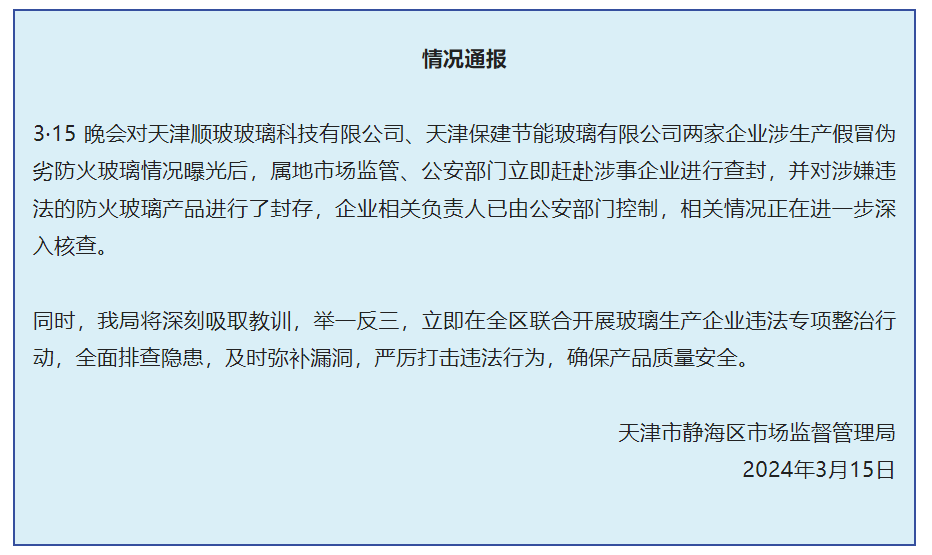 3月16日凌晨,天津市靜海區市場監督管理局通報:3·15晚會對天津順玻玻璃科技有限公司、天津保建節能玻璃有限公司兩家企業涉生產假冒偽劣防火玻璃情況曝光後,屬地市場監管、公安部門立即趕赴涉事企業進行查封,並對涉嫌違法的防火玻璃產品進行了封存,企業相關負責人已由公安部門控制,相關情況正在進一步深入核查。