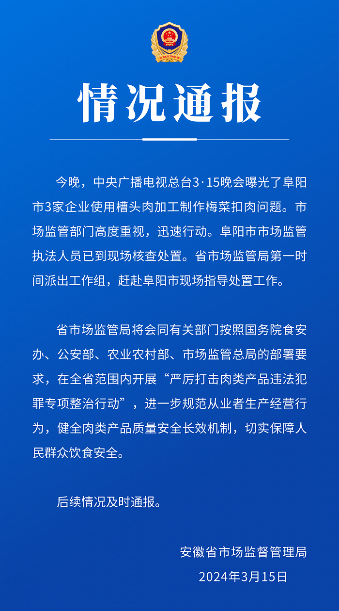 3月15日晚,安徽省市場監督管理局通報,今晚,中央廣播電視總枱3·15晚會曝光了阜陽市3家企業使用槽頭肉加工製作梅菜扣肉問題。市場監管部門高度重視,迅速行動。阜陽市市場監管執法人員已到現場核查處置。省市場監管局第一時間派出工作組,趕赴阜陽市現場指導處置工作。