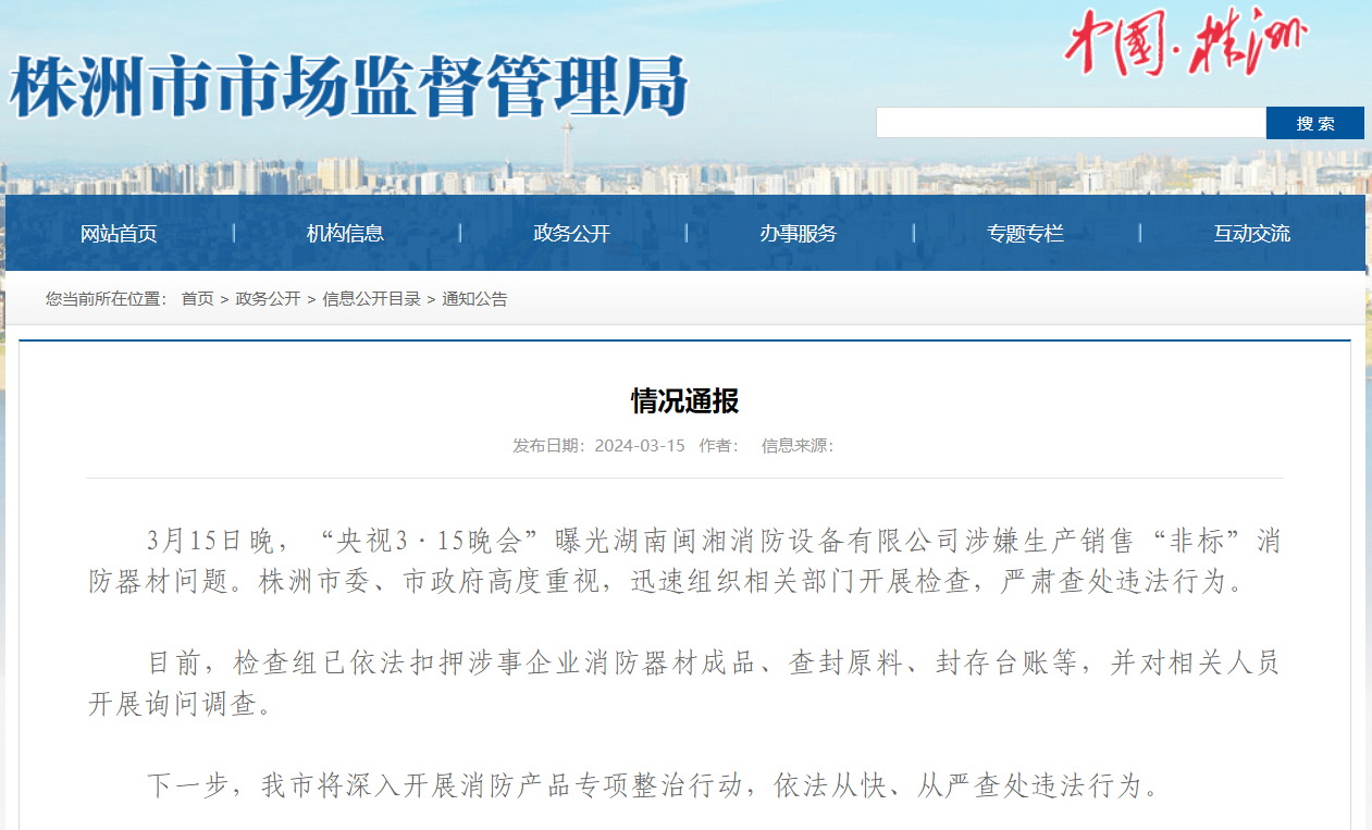 3月15日晚,株洲市市場監督管理局發佈情況通報:3月15日晚,“央視3·15晚會”曝光湖南閩湘消防設備有限公司涉嫌生產銷售“非標”消防器材問題。株洲市委、市政府高度重視,迅速組織相關部門開展檢查,嚴肅查處違法行為。目前,檢查組已依法扣押涉事企業消防器材成品、查封原料、封存台賬等,並對相關人員開展詢問調查。下一步,我市將深入開展消防產品專項整治行動,依法從快、從嚴查處違法行為。